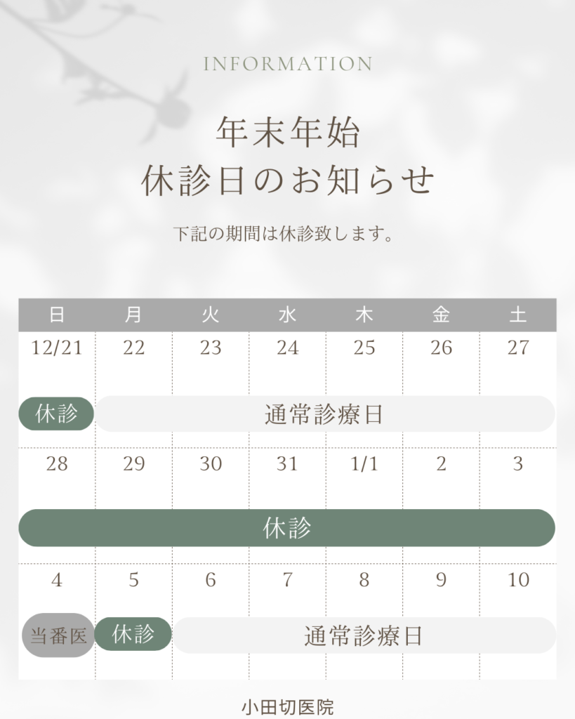 年末年始の休診は12/28(土)~1/5(日)までです。